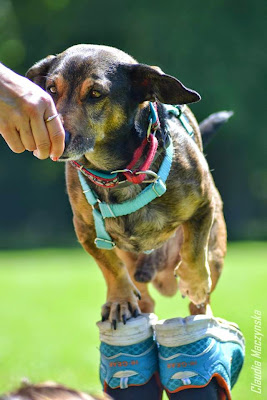 Drugiego dnia Barkasowi odwidziało się już to całe bycie niemiłym dla innych piesków. Po superowych zabawach z frisbee, typu 'trzeba sie stykać rękami i rzucać frisbee, komu spadnie robi od nowa', przeszliśmy do sesji z psami. Jako, że wcześniej była mowa o sztuczkach, stwierdziłam, że spróbuję z Barkasem coś, do czego była mi potrzebna mądra i dobrze wydająca smaki pomocna ręka :D Zrobiliśmy z Barko stanie na stopach, które szybko załapał. I o ile on szybko załapał, o tyle ja mam problem z skarmianiem go tam, ale to już szczegół, stary, chory i długi pies potrafi!